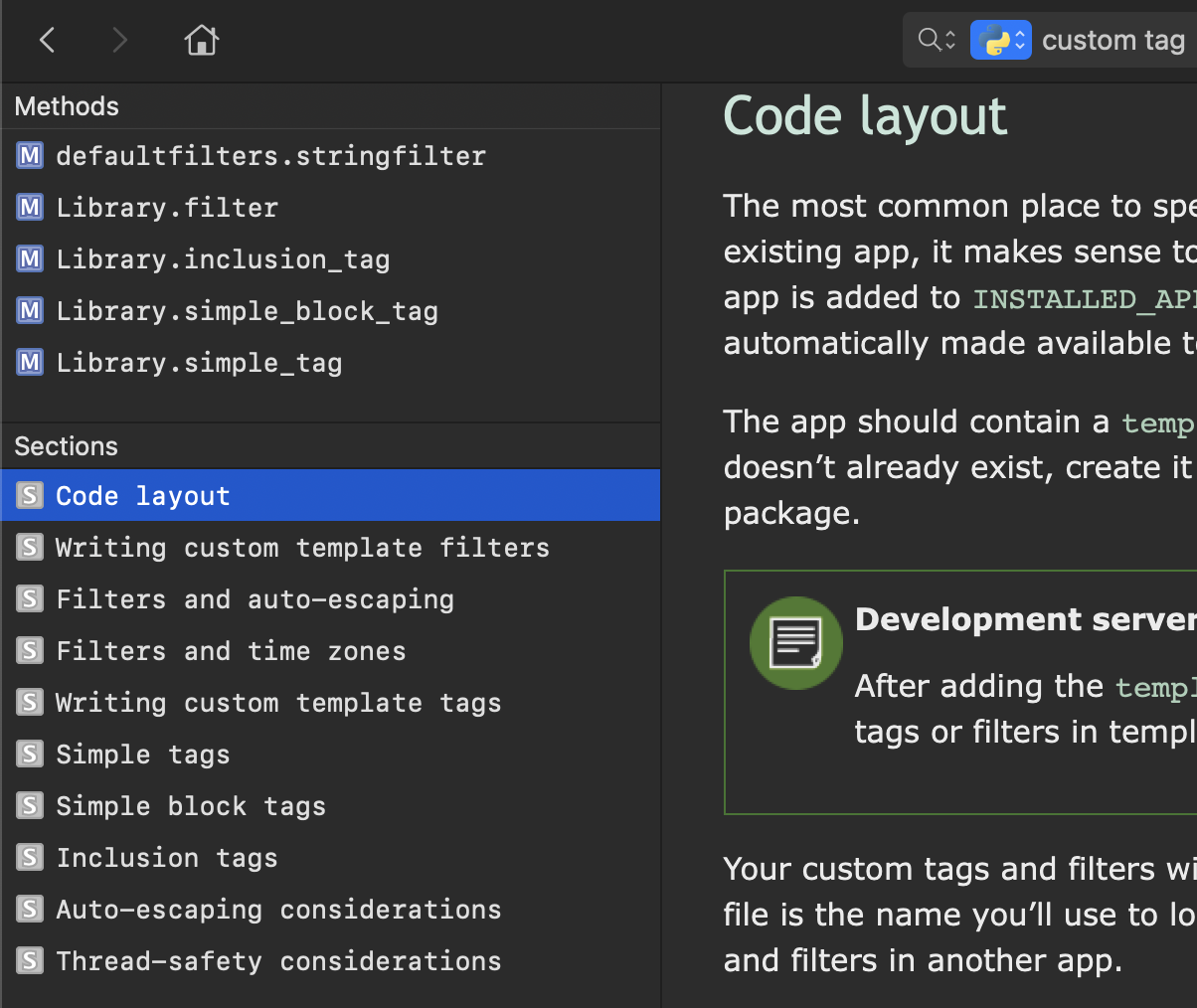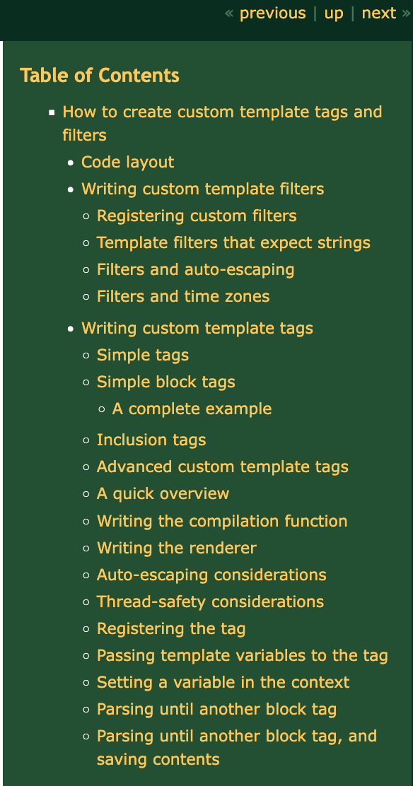 Please see the attached screenshots for Dash's ToC and the websites ToC for the same page "How to create custom template tags and filters".