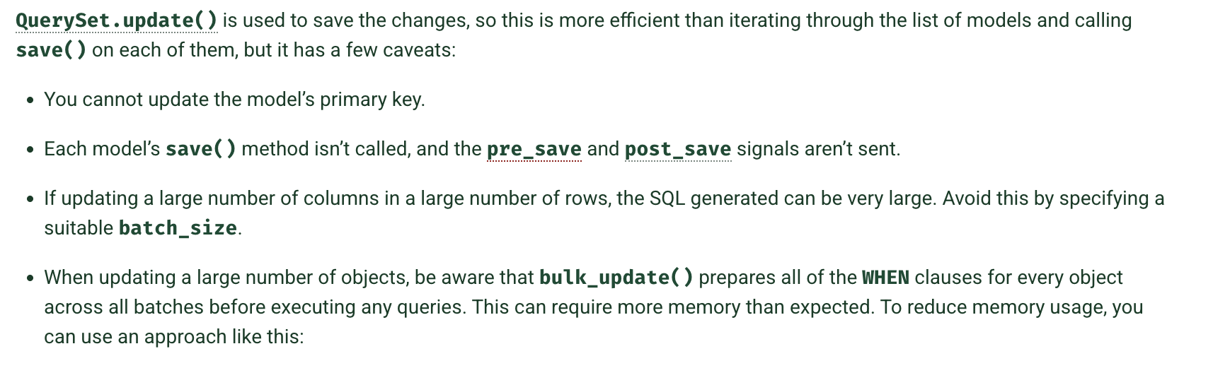 The documentation for QuerySet.update() briefly mentions that the model’s save() method is not called and pre_save/post_save signals are not sent. However, the docs do not explain why this matters or what those signals normally do. This could be confusing for new contributors who are understanding the difference between update(), and manually calling save() on each object. The current documentation could be updated to include information on why selecting the wrong method could disrupt current logic, or when it is safe/unsafe to use update().